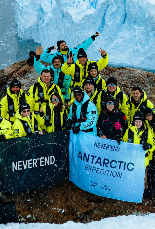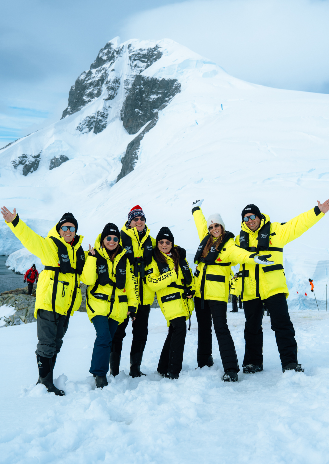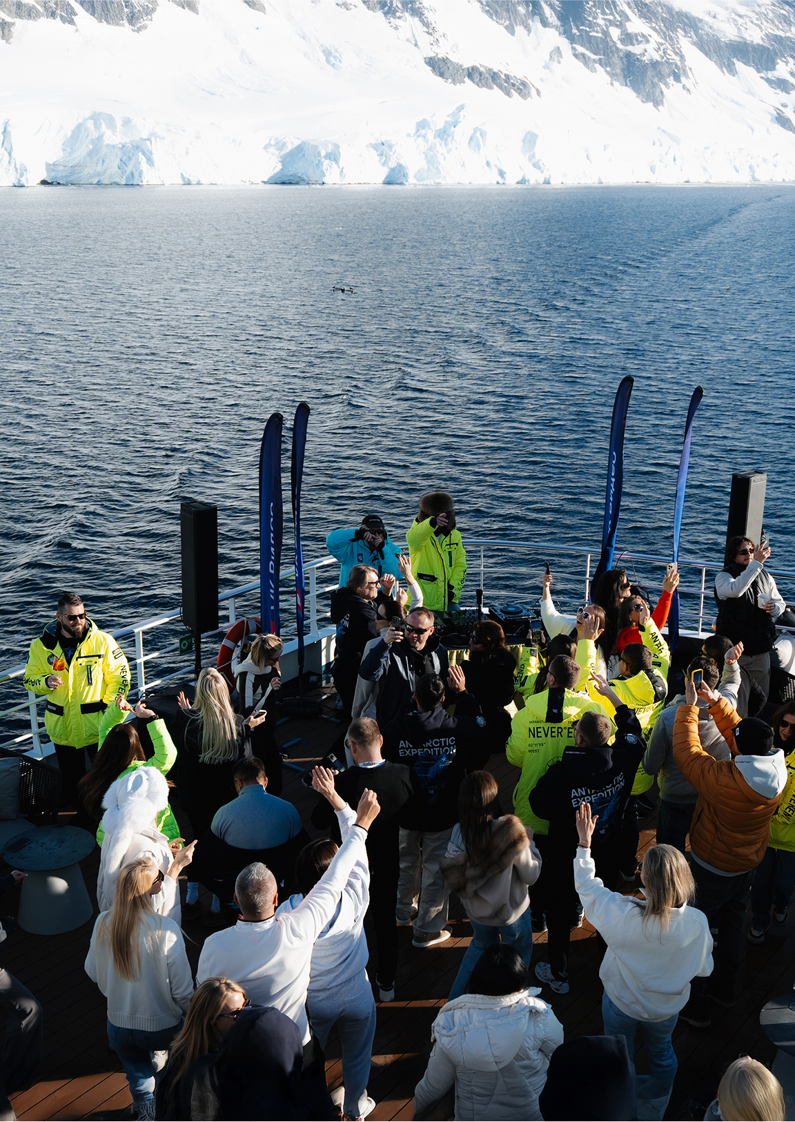 Танцы под диджей-сет на палубе с панорамным видом на ледяные пейзажи Антарктиды.